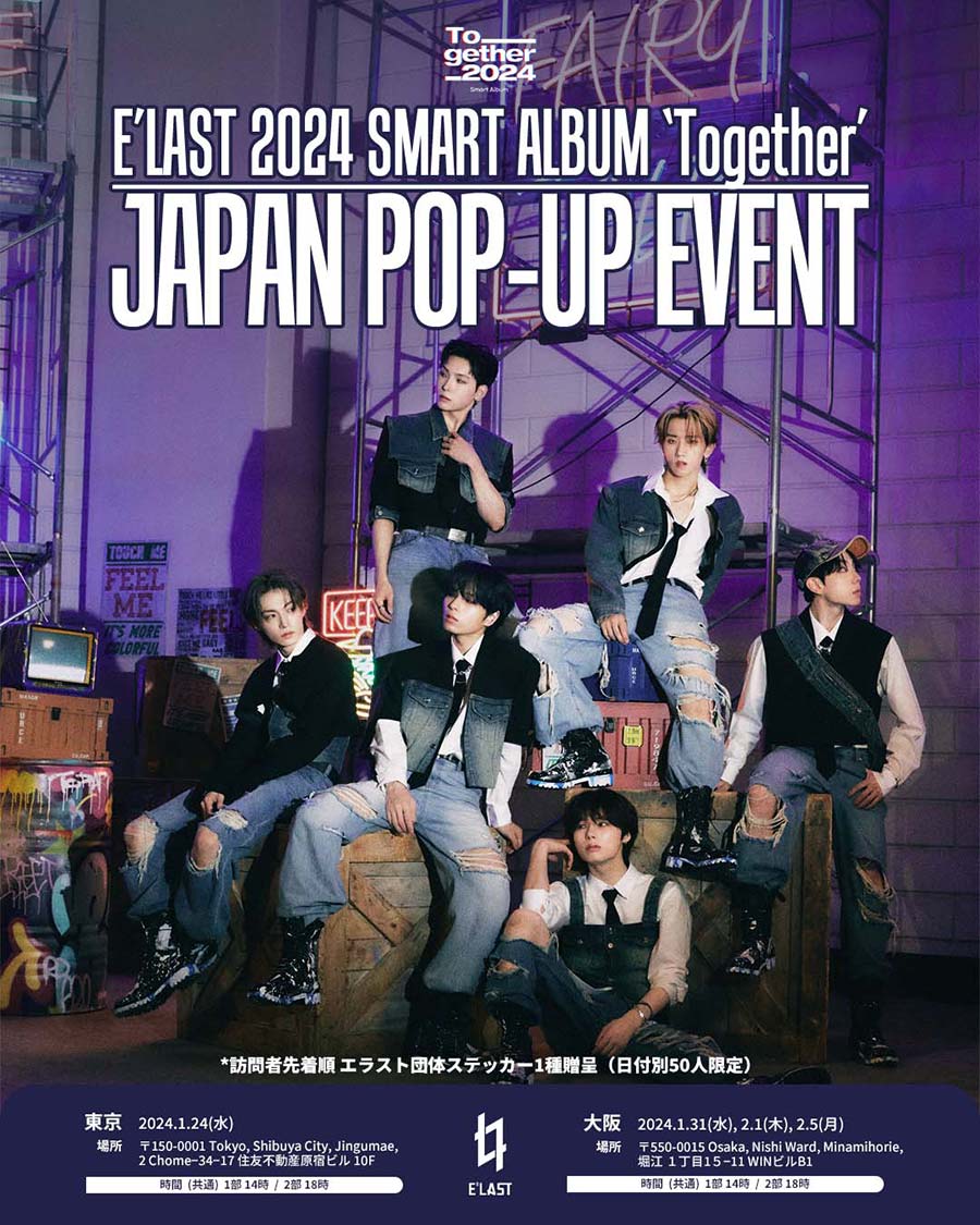 E’LAST 2024 SMART ALBUM ‘Together’リリース記念イベントの開催が決定しました。 各イベントの詳細、参加方法につきましては、各日程詳細をご確認ください。 たくさんのご来場を、お待ちしております! 【リリースイベント概要】 《POP-UP STORE EVENT》 1月24日(水) 1部:14:00 2部:18:00 会場:PEAKS STUDIO(〒150-0001 東京都渋谷区神宮前2丁目34-17 住友不動産原宿ビル10F) ポップアップイベント詳細はこちら 《CAFE EVENT》 日時:1月25日(木) 1部:15:00 2部:17:00 会場:PEAKS STUDIO(〒150-0001 東京都渋谷区神宮前2丁目34-17 住友不動産原宿ビル10F) カフェイベント詳細はこちら 《RELEASE EVENT》 日時:1月26日(金) 1部:16:30(ミニライブ+特典会) 2部:18:30(ミニライブ+特典会) 会場:ジールシアター東京(〒105-0004 東京都港区新橋3-5-10) ※ミニライブご観覧希望の方はイベント開始時間15分前に会場ロビーに集合をお願いいたします。 【特典会参加対象商品】 「Smart Album Together_2024」:3,000円(税込) -CALENDAR ver. -WHITE ver. -BLACK ver. -BLUE ver. >会場販売時間 13:00~16:30/18:00~19:00 【特典会内容】