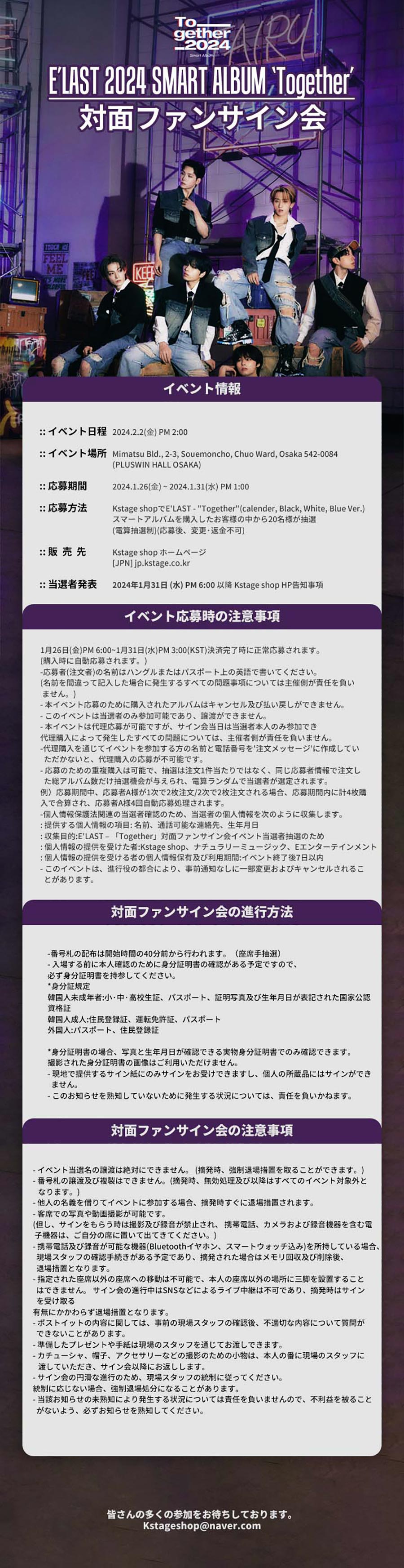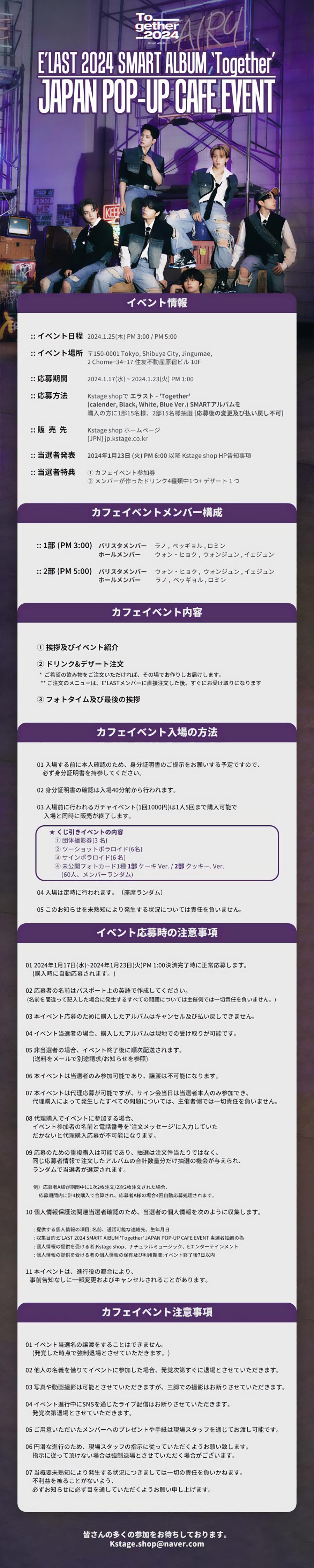 【イベント情報】 ★イベント日程 東京:2024年1月25日(木) ★特典イベント時間 1部15:00(14:20ロビー集合) 17:00(16:20会場ロビー集合) ★会場 〒150-0001 東京都渋谷区神宮前2丁目34-17 住友不動産原宿ビル10F ★応募方法 Kstage shopで E’LAST 'Together'(calender, Black, White, Blue Ver.) SMARTアルバムを 購入の方から抽選で1部15名様、2部15名様 当選者のみ ※応募後の変更及び払い戻し不可 ★販売先 Kstage.shop ホームページ https://jp.kstage.co.kr/ ★当選者発表 2024年1月23日(火)18:00以降 Kstage shop HPにて発表 https://jp.kstage.co.kr/ ★当選者特典 ①カフェイベント参加券 ②メンバーが作ったドリンク4種類1点+デザートメニューから1点 【カフェイベントメンバー構成】 1部(15:00の回)